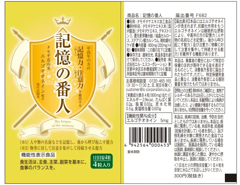 جاپان کی ایل ایس کارپوریشن کے ذریعہ لانچ کردہ ایرگوتھینین ضمیمہ ایک ایسی مصنوعات ہے جو درمیانی عمر اور بوڑھے لوگوں میں میموری میں کمی کو دور کرنے کے لئے ڈیزائن کیا گیا ہے۔