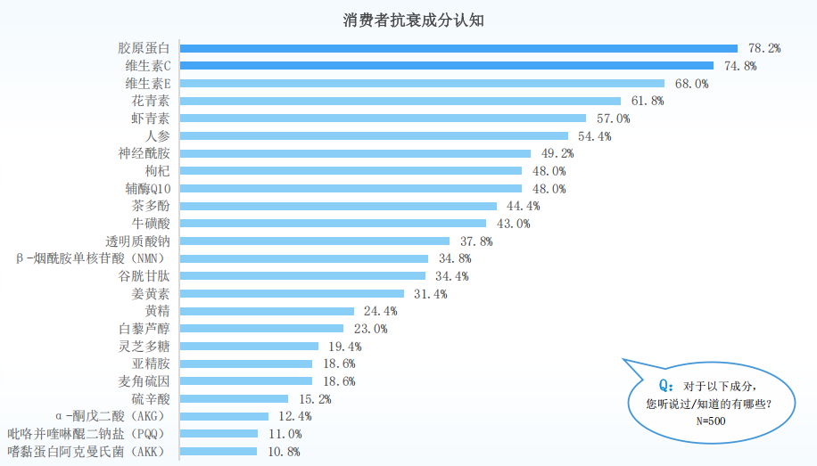 مارکیٹ کی تعلیم اور ترقی کی بدولت ، کولیجن اس وقت صارفین میں ایک انتہائی تسلیم شدہ "اینٹی ایجنگ جزو" ہے۔ مرکزی دھارے میں شامل اینٹی ایجنگ اجزاء کی تفہیم کے بارے میں سروے میں ، کولیجن (78.2 ٪) ، وٹامن سی (74.8 ٪) ، اور وٹامن ای (68 ٪) سب سے اوپر تین اجزاء ہیں جن کو صارفین زبانی اینٹی عمر رسیدہ مصنوعات کے لئے پہچانتے ہیں۔ مختلف عمر کے گروپوں میں عمر کے 5 اینٹی ایجنگ اجزاء کے خیالات میں سے ، کولیجن بلا شبہ "اسٹار اجزاء" ہے۔